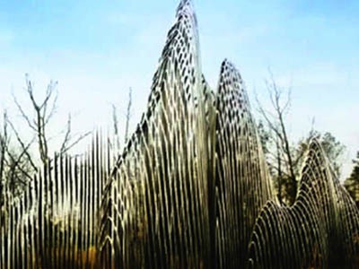 不銹鋼雕塑《樂山樂水》位于蕪湖雕塑公園內,規格80×30×30cm。以不銹鋼絲的排列組合方式來構建了一組空靈通透的山水畫卷,用現代的雕塑造型語言來表現中國傳統山水文化。呈現出虛空通透的雕塑形式;作品似山又似水,觀者可從中體味到山之“靜”及水之“動”,即“仁者樂山,智者樂水”。