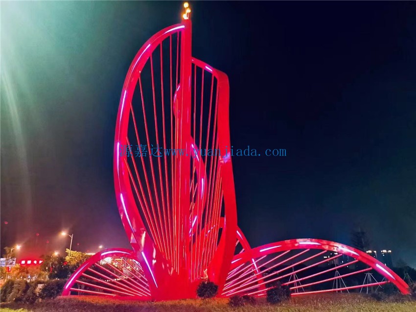 該雕塑是汕尾高新技術(shù)產(chǎn)業(yè)開發(fā)區(qū)的入口標志藝術(shù)雕塑,根據(jù)汕尾的市花大紅花進行主題創(chuàng)作,象征著熱情、勇敢、光榮與自豪,這一點與有著 “敢為天下先” 優(yōu)良傳統(tǒng)的汕尾人民的精神是追求一致的。雕塑分為左右兩個獨立體,右側(cè)主體顏色以大紅花為主,高26米,由8片花瓣組成,左側(cè)雕塑由花瓣加火炬組成,跨度40米,高7米,左右雕塑表面裝有流動、閃爍的多彩燈光效果。